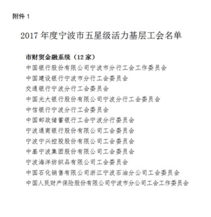 日前,收到寧波市總工會(huì)《關(guān)于確認(rèn)2017年度寧波市五星級(jí)活力基層工會(huì)、示范基層工會(huì)的通報(bào)》(甬總工〔2018〕59號(hào))的表彰文件,在全市開展的“五星級(jí)活力基層工會(huì)”評(píng)選中,寧波分行工會(huì)榜上有名!