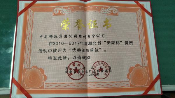 自活動(dòng)舉辦以來,隨州市分公司積極參與,充分調(diào)動(dòng)廣大職工參與群眾性安全生產(chǎn)活動(dòng)的積極性、主動(dòng)性和創(chuàng)造性,精心組織,推動(dòng)“安康杯”競(jìng)賽活動(dòng)持續(xù)深入開展;以人為本,安全發(fā)展,強(qiáng)化安全生產(chǎn)“紅線”意識(shí),以履行普遍服務(wù)為使命、以承擔(dān)社會(huì)責(zé)任為己任,服務(wù)于地方經(jīng)濟(jì)建設(shè)。本次獲獎(jiǎng),向社會(huì)各界展示了隨州郵政分公司抓安全、抓生產(chǎn)、保護(hù)職工的合法權(quán)益的責(zé)任擔(dān)當(dāng)。(湖北省郵政工會(huì))