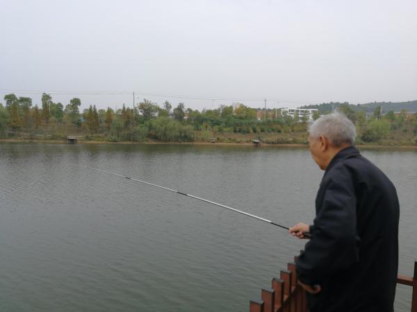 當日9點左右,老同志們齊聚彩色村,他們拿上魚竿、魚餌圍塘而坐,調漂、上餌、拋竿,靜待魚兒上鉤。