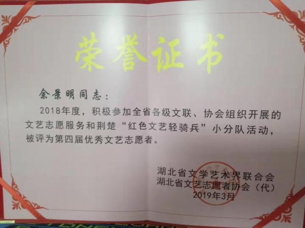 3月12日至13日,湖北省文聯(lián)十屆二次全委會在武漢召開,會議表彰了第四屆湖北省最美文藝志愿者和優(yōu)秀文藝志愿者。武漢郵政藝術(shù)團歌唱演員余景明蟬聯(lián)湖北省優(yōu)秀文藝志愿者稱號。