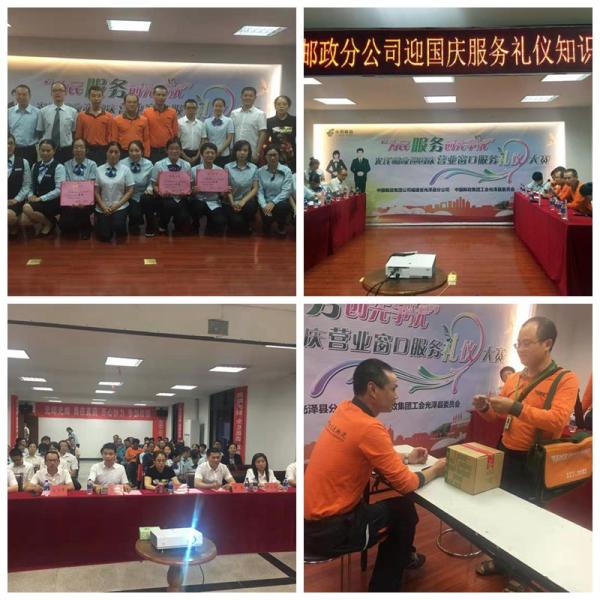 為喜迎新中國成立70周年,深化“不忘初心、牢記使命”主題教育活動,進(jìn)一步提高郵政職工崗位業(yè)務(wù)素質(zhì)和對外服務(wù)水平,樹立良好的社會服務(wù)形象,提升企業(yè)核心競爭力。9月25日晚,光澤縣分公司工會在八樓活動室,舉辦開展以“為民服務(wù)、爭先爭優(yōu)”為主題的,迎國慶——郵政職工服務(wù)禮儀知識競賽活動,來自各部室及班組支局80余名職工參加了活動。此次服務(wù)禮儀知識競賽共設(shè)立必答題、搶答題、情景模擬和自查自糾四個項目,共有12支代表隊參加比賽。競技場上角逐激烈,你追我趕,扣人心弦。必答題環(huán)節(jié),各參賽隊員沉著應(yīng)戰(zhàn),精準(zhǔn)回答,比分不相上下;搶答題環(huán)節(jié),隊員們每分必爭,互不相讓,一副誓決高低的架勢。最具引人入勝的是環(huán)節(jié)中設(shè)置建黨、建國史知識問答,選手們對答如流,反映了郵政職工在“不忘初心、牢記使命”主題教育活動中,扎實學(xué)習(xí)過硬的思想政治素質(zhì);情景模擬場景,個個繪聲繪色,生動形象的展現(xiàn)出不同工作崗位的服務(wù)要領(lǐng);自查自糾階段,以日常工作監(jiān)控為考題,貼合實際,起到很好的警示教育意義。賽場上每位參賽選手精神飽滿、斗志昂揚,踴躍搶答?,F(xiàn)場氣氛熱烈,氛圍融洽,臺下觀眾看的緊張捏汗,對選手們表現(xiàn)出的過硬心理素質(zhì)和優(yōu)良服務(wù)技能給予熱烈掌聲祝賀。整場比賽,充分展現(xiàn)了光澤郵政職工良好的業(yè)務(wù)知識素質(zhì)和優(yōu)良的服務(wù)禮儀風(fēng)采。