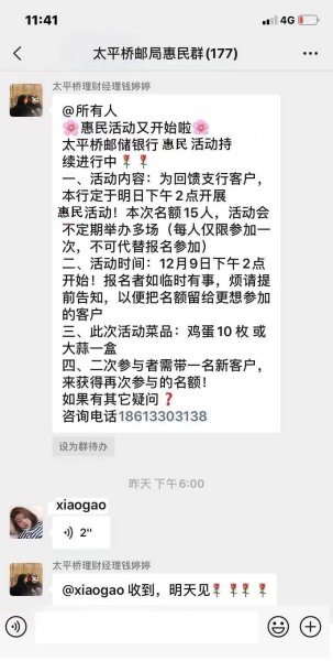 據(jù)了解,參與“便民服務商圈”金融客戶惠民體驗活動(以下簡稱活動)的百姓,能以低于市場均價的方式購買到“郵商聯(lián)盟”商戶(支行長期合作果蔬商)提供的時令果蔬,果蔬種類逢周更新,涉及西紅柿、香菇、油菜、大蒜、老玉米、扁豆等二十多種常見生活必需品。 活動前夕,客戶可通過支行客戶微信群發(fā)起的活動邀約信息,集中進行線上接龍式報名;“接龍報名”一方面便于支行工作人員高效采集活動參與人員信息,另一方面也是提高群成員互動、營造良好群營銷氛圍的好方法?;顒右?guī)定每名金融客戶常規(guī)僅可參與一次優(yōu)惠,若老客戶邀請新客戶入群,可二次參加優(yōu)惠活動。在活動現(xiàn)場,支行理財經(jīng)理穿插為客戶講解了資產(chǎn)配置、新版人民幣真?zhèn)舞b別技巧等內(nèi)容,并宣講了2021年代理金融“開門紅”即將推出的金融產(chǎn)品。