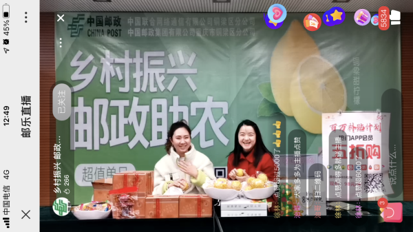 12月18日下午,重慶市銅梁區(qū)分公司聯(lián)合中國聯(lián)合網(wǎng)絡(luò)通信有限公司銅梁區(qū)分公司開展“鄉(xiāng)村振興、郵政助農(nóng)”郵樂平臺(tái)直播帶貨活動(dòng),為甜檸檬、鑫佳寶零食大禮包等特色農(nóng)產(chǎn)品代言。直播期間,通過開展“一元秒殺”“限量優(yōu)惠購”等方式,吸引了大波粉絲觀看,收獲點(diǎn)贊12000余次。截至發(fā)稿時(shí),已累計(jì)銷售助農(nóng)產(chǎn)品312單,銷售額1950元。