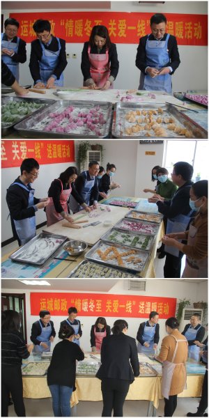 為支撐服務(wù)一線經(jīng)營發(fā)展,關(guān)心關(guān)愛員工,增強企業(yè)凝聚力,讓基層一線員工在冬至來臨之際吃上熱乎乎的手工餃子,運城市分公司工會在全市組織開展了“情暖冬至 關(guān)愛一線”送溫暖活動。12月21日一大早,市分公司黨委書記、總經(jīng)理王曉軍、紀(jì)委書記范志平、副總經(jīng)理徐志升、副總經(jīng)理郭丙、副總經(jīng)理、工會主席李挺宇與機關(guān)職能部門、經(jīng)營支撐部門20余人在機關(guān)食堂為一線員工親手包制冬至餃子,和面的、搟皮的、包餃子的,個個忙得不亦樂乎,原本樣式單一的餃子在大家的手中捏成漂亮的形狀,擺成了彩色各異的“冬至快樂”等造型,大家動作嫻熟,配合默契,不一會兒,一盤盤大小勻稱、緊實飽滿、形狀美觀的彩色餃子整齊地擺上臺面,隨后熱騰騰的餃子送至一線,帶來了市分公司黨委及工會對員工的關(guān)愛,讓員工們在寒冷冬日感受到“家”的溫暖和幸福。各網(wǎng)點在員工吃上熱騰騰的餃子同時也為客戶遞上了一碗愛心餃子,讓客戶感受到來自郵政的關(guān)愛。