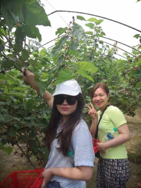 到達(dá)采摘基地果蔬園門口,大家紛紛拿好籃子,興沖沖得進(jìn)入了溫暖如春的大棚。滿園的桑葚香氣撲鼻而來,通紅的桑葚掛在綠葉叢中,嬌艷欲滴,讓人看著笑逐顏開。處處生機(jī)、繁枝累累的果實(shí)讓大家興奮不已,個(gè)個(gè)摩拳擦掌,躍躍欲試。果園里,大家歡聲笑語(yǔ),相互交流,拍照留念。沐浴著夏日的陽(yáng)光,徜徉在芳香四溢的果蔬園里,大家領(lǐng)略著迷人的夏景,心情舒暢,體驗(yàn)親手采摘的快樂。
