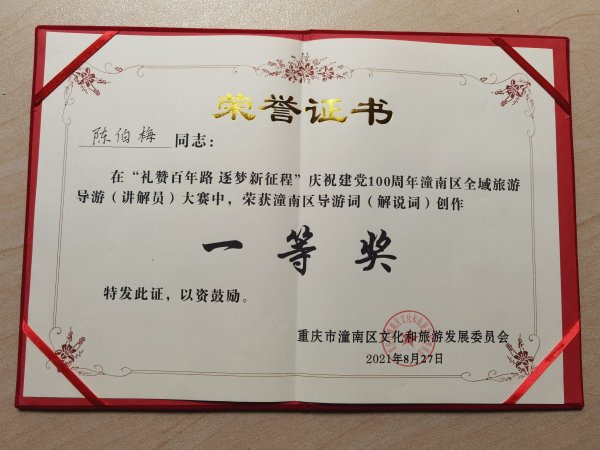 2021年8月27日,潼南區(qū)文化和旅游發(fā)展委員會(huì)舉辦的“禮贊百年路 逐夢(mèng)新征程”慶祝建黨100周年潼南區(qū)全域旅游導(dǎo)游(講解員)大賽勝利落下帷幕,潼南分公司四方郵政所負(fù)責(zé)人陳伯梅獲評(píng)潼南區(qū)導(dǎo)游詞(解說(shuō)詞)創(chuàng)作一等獎(jiǎng)。