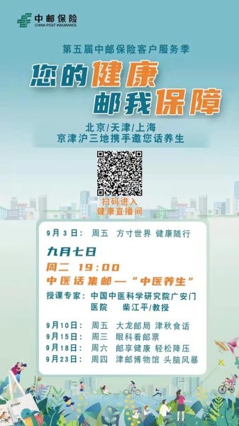 據(jù)了解,中郵人壽保險股份有限公司于7月15日至10月30日期間開展“美好生活 中郵相伴”第五屆客戶服務(wù)季活動,推出健康巡講問診、少兒郵信大賽、名家直播、“健康e站”等內(nèi)容。其中,9月集中開展“京津滬名醫(yī) 邀您話養(yǎng)生”健康直播系列活動,以中醫(yī)養(yǎng)生、食管腫瘤防治、心腦血管健康、眼科常識等為主題,特別融入郵政集郵、電商渠道等特色服務(wù),在向客戶傳遞健康理念、幫助客戶樹立保障意識的同時,讓客戶感受到具有郵政元素的服務(wù)體驗。健康直播系列活動共計6場,由中郵保險北京分公司、中郵保險天津分公司、中郵保險上海分公司聯(lián)合舉辦。(北京郵政工會)