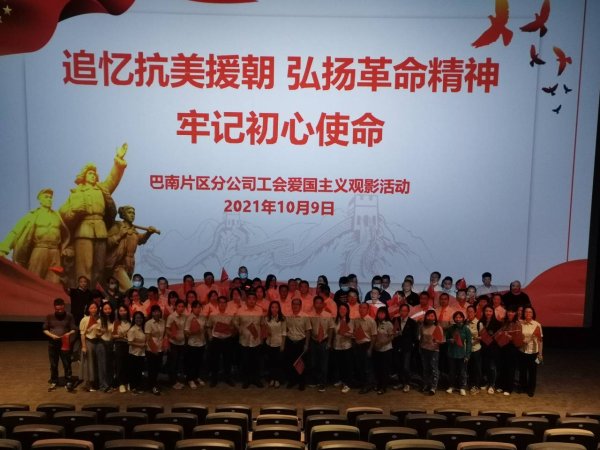 10月9日下午,巴南片區(qū)分公司黨委與工會聯(lián)合組織各黨支部、工會小組觀看抗美援朝戰(zhàn)爭題材影片《長津湖》,進一步厚植全體黨員群眾的愛國情懷。