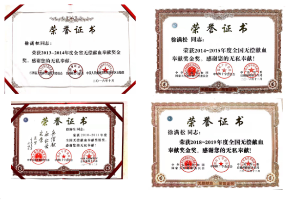 2010年,徐滿松接到了血站工作人員打來(lái)的電話,上饒市血站的血小板出現(xiàn)暫時(shí)短缺的現(xiàn)象,急需O型血小板。他二話不說(shuō),來(lái)到血站獻(xiàn)了兩個(gè)治療量的血小板(國(guó)家規(guī)定機(jī)采血小板捐獻(xiàn)間隔為兩周)。為了幫助更多需要用血的病人,徐滿松做了一個(gè)決定,以后要盡己所能參加無(wú)償獻(xiàn)血,由一開(kāi)始的隨機(jī)獻(xiàn)血到每半個(gè)月自主到到血站獻(xiàn)血小板。自此,他成為了固定的無(wú)償獻(xiàn)血者,這一堅(jiān)持就是21年。一本本鮮紅的《無(wú)償獻(xiàn)血證》放在一起,裝滿了抽屜,像一座座光榮的豐碑。每當(dāng)手機(jī)上收到“你捐獻(xiàn)的血小板檢測(cè)結(jié)果合格,已經(jīng)用于臨床”的短信,徐滿松心里都會(huì)有一種莫名的激動(dòng)與喜悅。