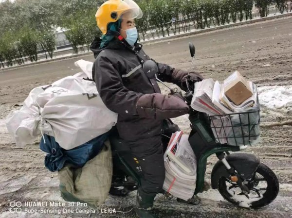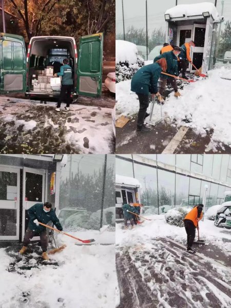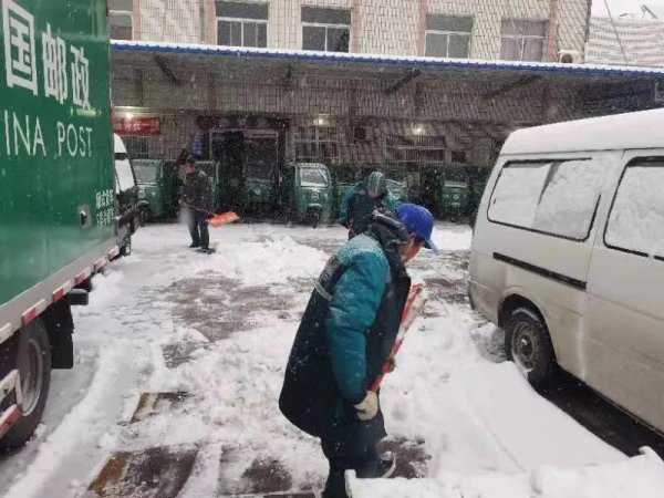 6日北京遭遇寒潮天氣,同城分分公司的職工依然堅(jiān)守工作崗位,不懼嚴(yán)寒,19點(diǎn)準(zhǔn)時(shí)來(lái)到客戶地址取件,投遞員往郵車(chē)上裝件的時(shí)候,寒風(fēng)裹著冰雨打在身上發(fā)出“刷刷”的聲音,大伙戰(zhàn)低溫、頂寒風(fēng)守護(hù)著每一份郵件。經(jīng)過(guò)一夜的暴雪,7日一早的東區(qū)集散大院積雪很深,二線職工提前到崗參加鏟冰掃雪,為投遞員出班做好準(zhǔn)備。大家先第一時(shí)間掃出一條三輪車(chē)出大院的道路,然后清除辦公區(qū)周?chē)e雪,通過(guò)大伙的努力,上午10點(diǎn)半院內(nèi)積雪基本清理完畢,二線職工辛苦的付出在關(guān)鍵時(shí)刻發(fā)揮了重大作用。
