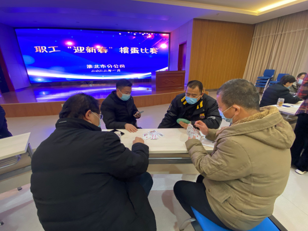 為喜迎虎年新春,豐富職工業(yè)余文化生活,緩解職工工作壓力,增強企業(yè)凝聚力,2022年1月12-13日,淮北市郵政工會組織開展了“迎新春”摜蛋比賽活動。本次比賽受到廣大職工的歡迎和踴躍報名,共有24對選手經(jīng)過抽簽配對12桌同時進行比賽。 此次摜蛋比賽采取淘汰賽。比賽過程中,參賽選手們密切配合,沉著應戰(zhàn),見招拆招。比賽現(xiàn)場選手和觀眾談笑風生,氛圍和諧愉快,賽事精彩紛呈。經(jīng)過兩個晚上6輪的激烈角逐,最終決出冠亞軍季軍。