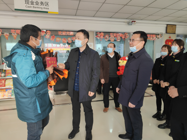 省公司領(lǐng)導(dǎo)一行在黃山市進(jìn)行新春慰問(wèn)的同時(shí),他們還深入基層一線,督導(dǎo)旺季金融業(yè)務(wù)發(fā)展和寄遞業(yè)務(wù)開(kāi)門(mén)紅情況。在黃山區(qū)太平路、仙源、歙縣許村三處網(wǎng)點(diǎn),省公司領(lǐng)導(dǎo)一行向奮戰(zhàn)在一線的員工們致以節(jié)日的祝福,并詳細(xì)了解了旺季金融發(fā)展情況和采取的措施,鼓勵(lì)網(wǎng)點(diǎn)理財(cái)經(jīng)理發(fā)揮作用,緊盯旺季發(fā)展目標(biāo),團(tuán)結(jié)一心,堅(jiān)決打贏跨賽戰(zhàn)役!在歙縣寄遞事業(yè)部郵件中心攬投部,省公司領(lǐng)導(dǎo)一行親切慰問(wèn)一線攬投人員,詳細(xì)了解2022年全縣寄遞業(yè)務(wù)各環(huán)節(jié)生產(chǎn)作業(yè)情況,盯囑管理人員和一線員工在抓好生產(chǎn)的同時(shí),毫不放松疫情防控工作,為2022年寄遞業(yè)務(wù)發(fā)展開(kāi)好局、起好步,以穩(wěn)健的步伐實(shí)現(xiàn)寄遞業(yè)務(wù)“虎虎生威”開(kāi)門(mén)紅!