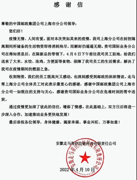 他說道,“我們因?yàn)橐咔橐呀?jīng)在公司關(guān)了五天了,真的是彈盡糧絕,上海郵政國際業(yè)務(wù)分公司的領(lǐng)導(dǎo)專程給我們送來了礦泉水和食物,太感謝了!真是疫情無情,人間有愛啊!”該公司領(lǐng)導(dǎo)之后也特地向國際業(yè)務(wù)分公司表達(dá)了誠摯的謝意,“郵政真是雪中送炭啊,員工們分到物資都好高興!”