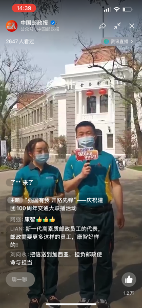 十大篇章、200多家全國優(yōu)秀青年組織,展示逢山開路、遇水架橋的開路先鋒精神。來自北京郵政的優(yōu)秀青年代表、中國郵政集團有限公司清華大學郵政支局康智,出現(xiàn)在第四篇章《堅守匠心》?!皬妵形?,開路先鋒” 交通運輸部“強國有我 開路先鋒 慶祝建團 100 周年交通大聯(lián)播活動” 受到網(wǎng)友熱情關(guān)注,400萬網(wǎng)友觀看了聯(lián)播活動。主播李敏和清華大學郵政支局營業(yè)部經(jīng)理康智共同出鏡。
