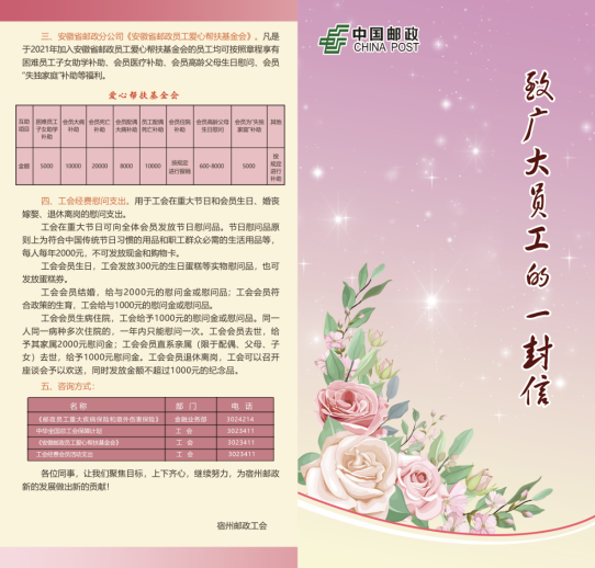 內(nèi)容包含五個(gè)方面:一是中郵保險(xiǎn)《郵政職工重大疾病保險(xiǎn)和意外傷害保險(xiǎn)》;二是中華全國總工會(huì)《在職職工意外傷害互助保障計(jì)劃》《在職職工重大疾病互助保障計(jì)劃》《在職女職工特種疾病互助保障計(jì)劃》;三是安徽省郵政分公司《安徽省郵攻職工愛心幫扶基金會(huì)》;四是工會(huì)經(jīng)費(fèi)慰問支出;五是咨詢方式。