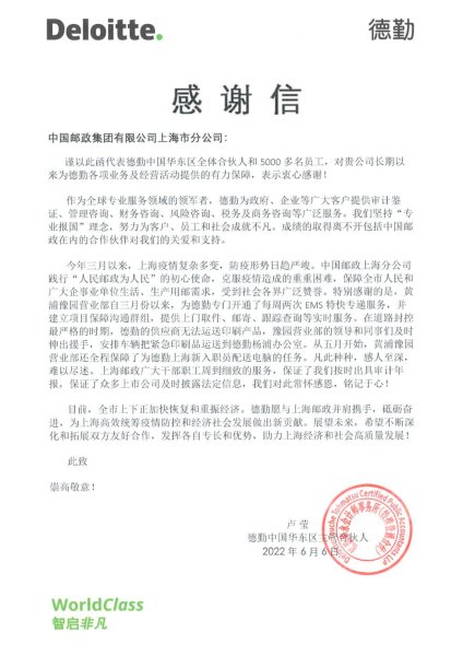在六月復(fù)工復(fù)產(chǎn)之際,為了表達(dá)疫情期間豫園營業(yè)部的大力支持與幫助,德勤公司專程寫了一封感謝信,深切表達(dá)了感謝之情,感人至深。并表示希望雙方加大合作力度。(上海郵政工會)