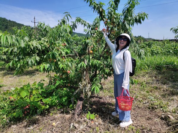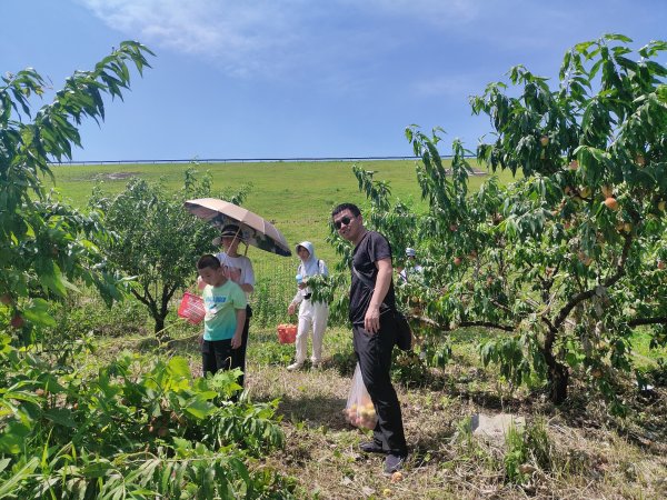 在黃金水庫旁,放眼望去,藍(lán)天白云碧水漣漪,偶爾跳出水面的小魚,還有那追逐嬉戲的鳥兒,構(gòu)成了一幅絕好的水墨丹青。下車后,大家歡快地奔向采摘園,呼吸著山林的清新空氣,感受著大自然的隨心暢意,大家的心情分外輕松。累累蜜桃散發(fā)出誘人的果香掛滿枝頭,樹枝都被壓彎了腰。摘蜜桃、品蜜桃......采摘的快樂、品嘗的喜悅、打趣的笑聲溢滿采摘園。每個人都收獲滿滿,體驗(yàn)了自由采摘帶來的收獲與快樂。大家一路歡聲笑語,平時工作的疲勞都融化在這陽光明媚的時光里。