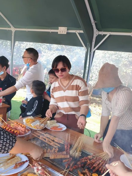 短暫休息后,自助燒烤開始了,燒烤場地裊裊炊煙升起,大家手上、嘴上都忙個不停,一邊吃這桌一邊吃那桌,嘗遍各個燒烤桌上的不同風味,大家互相調(diào)侃、有說有笑,空氣中洋溢著一片團結(jié)友愛、快樂幸福的味道。