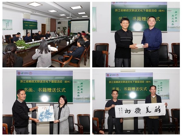 省郵政文聯(lián)的會員們?yōu)獒橹菔蟹止編砗材で?、書籍作品,并在現(xiàn)場開展創(chuàng)作活動,揮毫?xí)鴮懶聲r代衢州郵政精神,潑墨渲染衢州郵政風(fēng)貌,為衢州市、縣各分公司贈送一幅幅生動的書畫作品,衢州市分公司總經(jīng)理俞亮接受了省郵政文聯(lián)的捐贈。