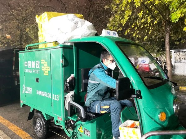 淅淅瀝瀝的秋雨中,郵車漸漸模糊在前方,回頭看去,攬投部的燈光依舊通明……(北京郵政工會)