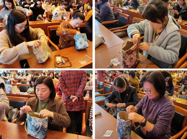在油畫風(fēng)托特包制作環(huán)節(jié),手工老師講解了制作油畫風(fēng)托特包的技巧和注意事項(xiàng),然后老師教女員工們?cè)趺窗惭b手環(huán)、縫制包邊,最后呈現(xiàn)出完美的成品。經(jīng)過套袋、釘扣、縫邊等一道道工序,約花了一個(gè)多小時(shí),一個(gè)個(gè)精美的油畫風(fēng)托特包就做好了。女員工對(duì)自己的作品也非常滿意,紛紛拍照留念。