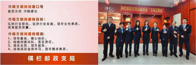 創(chuàng)建籌備需要將近1年的時(shí)間,為做好創(chuàng)崗工作,橫欄支局成立“巾幗文明崗”創(chuàng)建活動(dòng)工作領(lǐng)導(dǎo)小組,支局長(zhǎng)帶領(lǐng)團(tuán)隊(duì)明確建崗目標(biāo)、建章立制、布置廳堂,將創(chuàng)崗工作融入日常工作中,促使全員積極投入,營(yíng)造出濃厚的創(chuàng)崗氛圍。