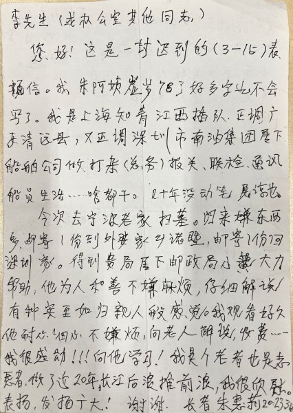 近日,市分公司收到一封表?yè)P(yáng)信,信中表?yè)P(yáng)了浦東新區(qū)分公司張楊路支局下屬?zèng)軚|網(wǎng)點(diǎn)的營(yíng)業(yè)員陳俊宇。陳俊宇耐心、細(xì)心、貼心的服務(wù)讓上海知青朱阿姨感受到了賓至如歸的溫暖。