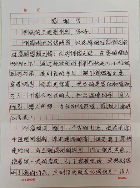 收到郵件,洪女士十分感動(dòng)與感謝,她寫(xiě)了一封信郵寄到北京郵政。信中她這樣說(shuō): 最讓我感動(dòng)的是您時(shí)刻牽掛著我的快遞,犧牲周末的休息,早上6點(diǎn)第一時(shí)間告訴我快遞信息,對(duì)于一個(gè)身患疾病渴望及早治療的人來(lái)說(shuō),這份關(guān)心是多么及時(shí),多么溫暖,多么珍貴! 我深切地感覺(jué)到一名普通郵政員工,不僅敬業(yè)專(zhuān)業(yè),更是一個(gè)有溫度有愛(ài)心的善良之人。通過(guò)您,通過(guò)郵政客服窗口,讓我重新認(rèn)識(shí)了一個(gè)有速度、有效率更有溫度的郵政!