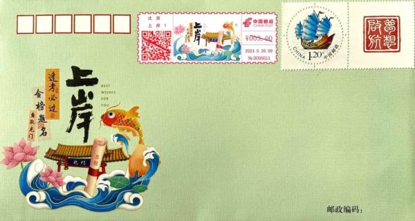 據(jù)悉,此次啟用的“上岸”郵資機(jī)宣傳戳和紀(jì)念封由青年設(shè)計(jì)師毛利設(shè)計(jì),圖案設(shè)計(jì)風(fēng)格采用了中國(guó)傳統(tǒng)與現(xiàn)代相結(jié)合的方式,選用了“鯉魚(yú)跳龍門(mén)”這一傳統(tǒng)素材,配以上岸元素、喜報(bào)及時(shí)下網(wǎng)絡(luò)用語(yǔ),給郵資機(jī)戳賦予了新的內(nèi)涵。紀(jì)念封貼“夢(mèng)想遠(yuǎn)航”個(gè)性化郵票原票,為所有莘莘學(xué)子保駕護(hù)航,為正在愛(ài)情征途上的情侶祈愿連理,為各種努力的人們馬到功成。該枚郵資機(jī)宣傳戳使用期限為一年。(北京郵政工會(huì))