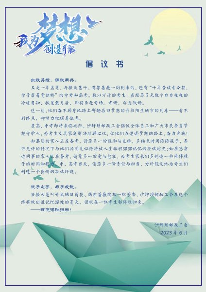 前日,沙坪壩區(qū)分公司行政及工會連續(xù)第三年發(fā)起《倡議書》,號召全體干部職工爭當夢想守護人,為考生及家長創(chuàng)造良好應試環(huán)境。此舉得到基層員工的一直好評。