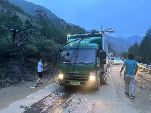8月3日16點,貨物裝卸完畢,王宇萱跟隨司機師傅們奔向目的地。受大暴雨影響,門頭溝山區(qū)道路被沖毀,山體塌方,空中倒塌的電線纏在車上,王 宇萱立即下車,清理路障及電線。他想著一定要排除萬難,把物資運送到位。夜路難行,王 宇萱一刻不敢休息,協助司機盯好前方的路。晚上8點,歷經4個小時,他們終于安全到達雁翅鎮(zhèn)政府,順利將救災物資送到指定地點。接著卸車近3個小時,稍作休息后開始返程,凌晨2點28分順利到達石龍支局大院,圓滿完成此次緊急運送任務。8月4日,4點06分,王 宇萱在朋友圈寫下:安全到家,借個光也算是為救災出把力了。