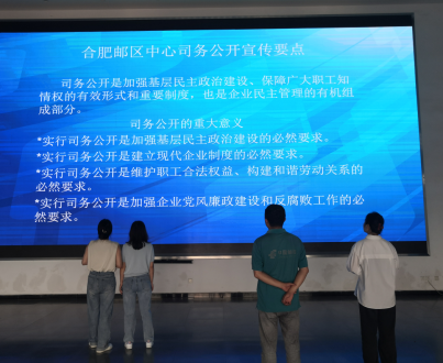 近期,根據(jù)安徽省郵政工會工作部署,合肥郵區(qū)中心局工會通過生產(chǎn)場地電子顯示屏播放司務(wù)公開宣傳要點(diǎn),并通過工會工作群組織學(xué)習(xí)集團(tuán)公司黨組《關(guān)于進(jìn)一步規(guī)范和加強(qiáng)郵政企業(yè)司務(wù)公開工作的指導(dǎo)意見》文件精神,并下發(fā)司務(wù)公開宣傳教育材料,要求中心各級工會組織積極開展涉及企業(yè)民主管理、司務(wù)公開相關(guān)文件精神和業(yè)務(wù)知識的學(xué)習(xí)宣傳活動,深入了解進(jìn)一步規(guī)范和加強(qiáng)司務(wù)公開工作的總體要求,不斷提高司務(wù)公開實效。 多年來,在上級工會重視關(guān)心下,合肥郵區(qū)中心堅持以服務(wù)大局、服務(wù)改革、服務(wù)基層為工會工作中心,不斷推進(jìn)企業(yè)司務(wù)公開民主管理制度化、規(guī)范化、法制化、標(biāo)準(zhǔn)化建設(shè),激發(fā)廣大職工的主人翁精神,維護(hù)和保障廣大職工的民主政治權(quán)利,建立和諧的勞動關(guān)系。該中心曾榮獲合肥市廠務(wù)公開民主管理先進(jìn)單位稱號。