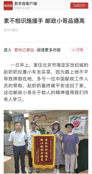 “今天幸虧遇到了您這樣的熱心人愿意幫助,要不我自己都不知道該怎么辦了?!崩先艘贿吜鳒I,一邊拿出一沓現(xiàn)金往劉東升手里送。“大媽,這錢我不能收,誰都有遇到難事的時(shí)候,能幫一把幫一把。”劉東升婉言謝絕了老人的酬謝,并寬慰其安心養(yǎng)病。在老人的一再堅(jiān)持下,他留下了自己姓名、電話和工作單位。沒過多久,老人的女兒、外孫女便帶著錦旗登門致謝?!澳鲃?dòng)伸出援手幫助我母親,真的是太感謝了!中國(guó)郵政不愧是國(guó)企,值得百姓信賴,培養(yǎng)出來的員工也是好樣的!”老人的女兒眼含熱淚說,今天特意帶自己的女兒來這里學(xué)習(xí),女兒是新京報(bào)的小記者,一定要把這樣的正能量傳播出去。