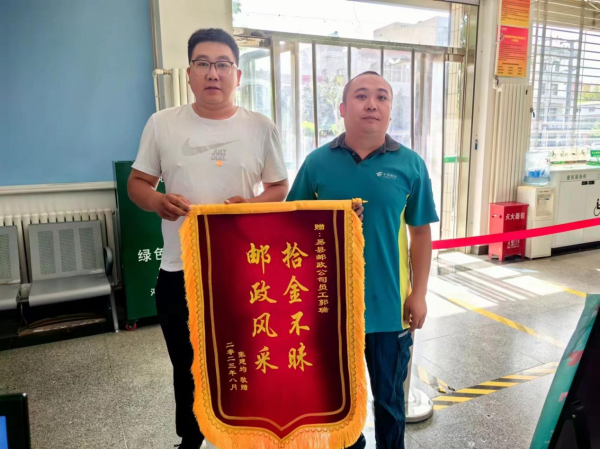 2023年9月13日上午9點(diǎn),失主張先生來(lái)到了易縣郵件處理中心,送來(lái)一面寫有“拾金不昧,郵政風(fēng)采”的錦旗,并拉著快遞員郭瑞同志的手表示感謝,他為郵政人的暖心舉動(dòng)點(diǎn)贊。
