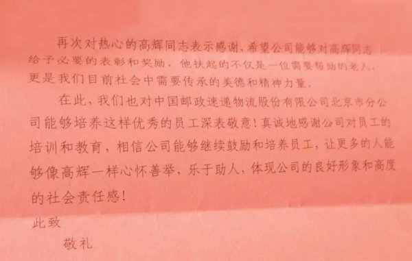 不久之后,高輝就得知李女士寫(xiě)了一封感謝信并郵寄到北京市郵政分公司,感謝他的同時(shí),高度贊揚(yáng)了郵政人高尚的道德情操以及社會(huì)責(zé)任感。“收到感謝信,我很意外、也很欣慰?!备咻x說(shuō),自己只是做了一件小事,卻收獲了這份意外的感動(dòng)。