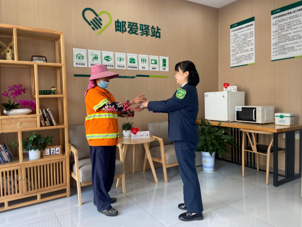 為更好服務(wù)廣大戶(hù)外工作者,前期,武漢市郵政工會(huì)統(tǒng)一設(shè)計(jì)了“郵愛(ài)驛站”標(biāo)識(shí)牌,每個(gè)網(wǎng)點(diǎn)結(jié)合實(shí)際情況,制作并懸掛在醒目位置,方便戶(hù)外工作者能順利找到服務(wù)站點(diǎn)。驛站內(nèi)部配備了桌椅、飲水機(jī)、微波爐、冰箱、雨具、手機(jī)充電插排等基本設(shè)施,提供了Wi-Fi、報(bào)刊閱讀、便民藥箱、食物加熱、影視觀看、信息咨詢(xún)等多元化服務(wù)事項(xiàng),為戶(hù)外工作者提供更多暖心服務(wù)。