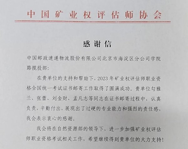 新年伊始,學(xué)院路攬投部全體人員以良好的精神狀態(tài)和飽滿(mǎn)的熱情投入各項(xiàng)工作。與之對(duì)應(yīng)的,用戶(hù)用感謝信和錦旗給他們的工作打出一百分?!爸x謝你們的付出,證書(shū)寄遞工作已圓滿(mǎn)收官,為郵政的服務(wù)點(diǎn)贊!”1月10日,中國(guó)礦業(yè)權(quán)評(píng)估師協(xié)會(huì)的崔老師專(zhuān)程來(lái)到學(xué)院路攬投部送上感謝信,并表示,由于寄遞的物品比較特殊,學(xué)院路攬投部提供了郵件查詢(xún)的延伸服務(wù),寄遞中出現(xiàn)的問(wèn)題也都得到妥善處理,為2023年礦業(yè)權(quán)評(píng)估師職業(yè)資格全國(guó)統(tǒng)一考試工作取得圓滿(mǎn)成功提供了有力保障。