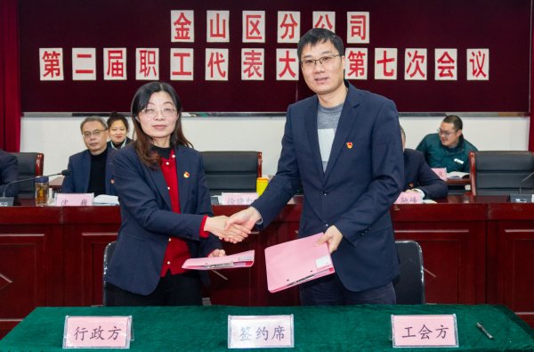 區(qū)分公司副總經(jīng)理(主持工作)徐曉紅代表行政方、區(qū)分公司工會主席高杰斌代表工會方共同簽訂了《中國郵政集團有限公司上海市金山區(qū)分公司2024年實事項目方案》。