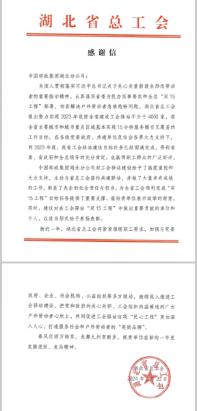 2月20日,湖北省總工會向省郵政分公司發(fā)來感謝信,對省分公司2023年高度重視和大力支持工會驛站建設工作,在與省總工會驛站共建中,做了大量卓有成效的工作,彰顯了央企的社會責任與擔當,為全省工會順利完成“雙15工程”目標任務提供了重要支撐,表示誠摯感謝。
