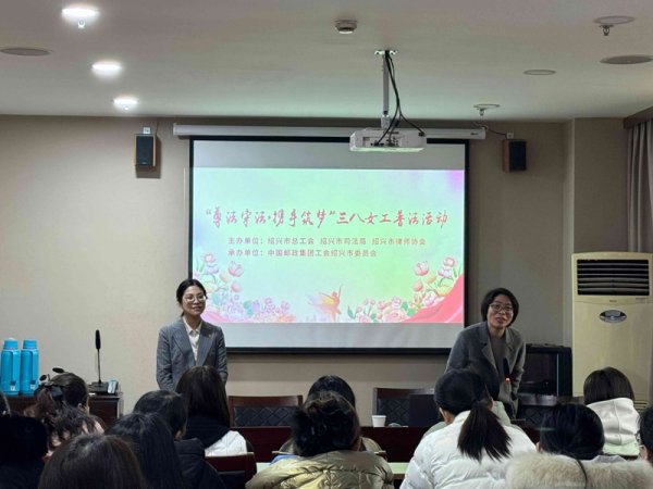為進(jìn)一步激發(fā)女職工創(chuàng)造熱情,更好地為女職工提供優(yōu)質(zhì)、專業(yè)的法治宣傳服務(wù),強(qiáng)化女職工維權(quán)意識(shí),維護(hù)自身合法權(quán)益,3月5日,紹興市郵政工會(huì)與紹興市總工會(huì)一同舉辦“尊法守法,攜手筑夢”三八節(jié)女職工普法講座。