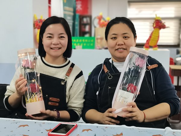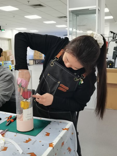 老師首先講述了皮革的基本知識(shí),隨后為大家講解皮革玫瑰花的制作流程,跟隨老師的講解,大家各自挑選了自己喜歡的皮革顏色,迫不及待地開(kāi)始動(dòng)手體驗(yàn)。一朵朵花瓣在大家的巧手中變得生動(dòng)美麗,經(jīng)過(guò)一番精心制作,一朵朵嬌艷欲滴的漂亮玫瑰花便制作完成。大家將親手制作的玫瑰花插入透明花桶,用燈帶點(diǎn)綴?;顒?dòng)現(xiàn)場(chǎng)還為大家準(zhǔn)備了“女神節(jié)快樂(lè)”的手寫(xiě)卡片,將卡片放入花桶,打開(kāi)燈的瞬間幸福感、氛圍感拉得滿滿的。