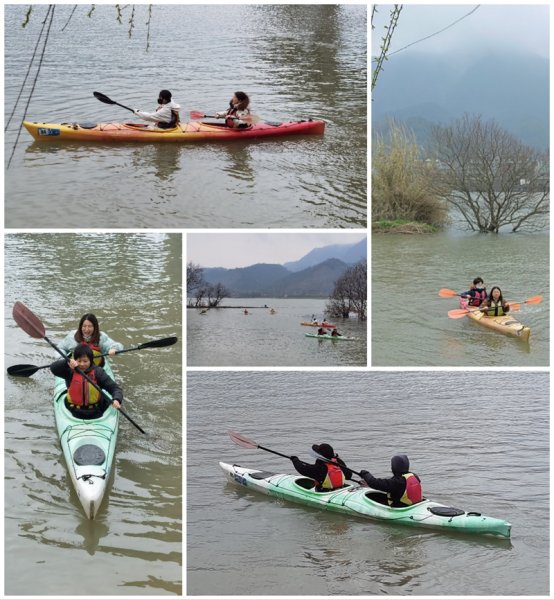 抵達(dá)桐洲島后,首先進(jìn)行的是刺激的皮劃艇體驗(yàn)項(xiàng)目。大家先在專(zhuān)業(yè)教練的指導(dǎo)下,學(xué)習(xí)了皮劃艇的基本技巧和安全知識(shí);隨后便兩兩組隊(duì),分批登上皮劃艇,泛舟于富春江上,欣賞春日的美景。從初登艇時(shí)的手忙腳亂、進(jìn)退左右不分,到與搭檔磨合熟練后的進(jìn)退自如、快慢由心,大家在歡聲笑語(yǔ)中悄然增進(jìn)了彼此的配合與默契。