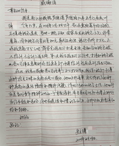 2月18日下午,惠南支局投遞員鄔正良像往常一樣出班投遞。3點半左右他來到黃路菜市場附近,在地上撿拾到一個錢包,打開發(fā)現(xiàn)里面有現(xiàn)金、銀行存折,還有兩張身份證,仔細一看,身份證屬于八九十歲的老人。想到失主必定心急如焚,鄔正良第一時間撥打了110,主動匯報了撿拾錢包情況,并在送完郵件后將錢包送至當?shù)嘏沙鏊?。事后,得到失主家屬電話稱贊。鄔正良說,自己的舉動并不特殊,相信很多人都會這么做,質(zhì)樸的話語讓人心生敬意。