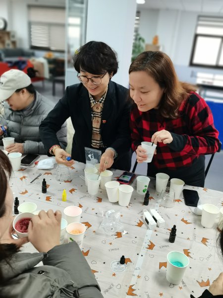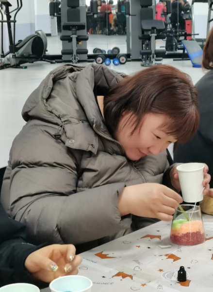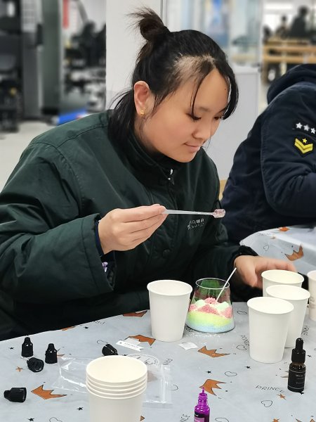 活動現(xiàn)場,老師講述了沙畫、香薰蠟燭的起源與發(fā)展,細(xì)致講解了香薰蠟燭的制作流程、功效以及注意事項,大家看得津津有味,紛紛摩拳擦掌、躍躍欲試。隨后在老師的指導(dǎo)下,大家各自挑選了自己喜歡的香薰精油,將選好的精油和顏料滴入白沙蠟里不停攪拌,調(diào)制出帶有自己喜歡的氣味和顏色的沙蠟,并將不同色彩的沙蠟層層堆疊,組合成自己心中的圖案,經(jīng)過一個小時的制作,一個個帶有自己創(chuàng)作元素和藝術(shù)審美、芬芳濃郁的沙畫蠟燭便制作完成了。