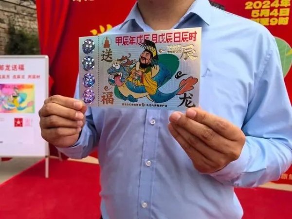 《辰龍送褔》明信片印有大運(yùn)河源頭遺址公園都龍王廟的“龍王圖案”,明信片的左側(cè)運(yùn)用了鐳射工藝,設(shè)置了“刮刮樂”模式,最高獎項可獲得一張居庸關(guān)長城景區(qū)的門票,明信片上印有“2024年5月4日7時至9時甲辰年戊辰月戊辰日丙辰時”的字樣,紀(jì)念意義十足。