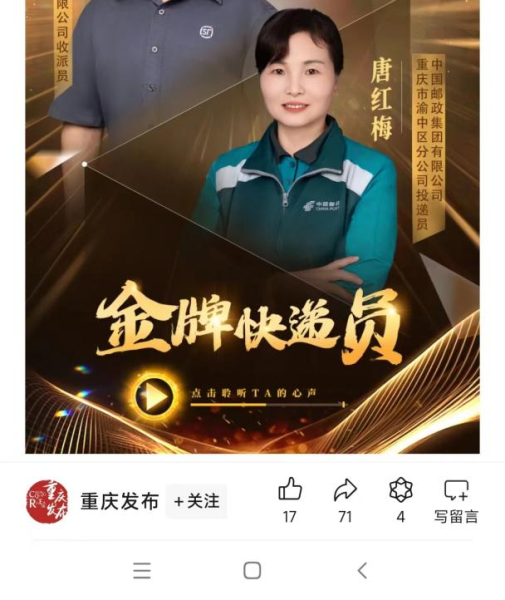 5月9日,由渝中區(qū)委宣傳部、渝中區(qū)委網(wǎng)信辦、渝中區(qū)文明辦、渝中區(qū)新時(shí)代文明實(shí)踐指導(dǎo)中心主辦,人民網(wǎng)重慶頻道承辦的2024年“渝中文明之星”評選中,渝中郵政攬投員唐紅梅獲得2024年“渝中文明之星——金牌快遞員”榮譽(yù)稱號。