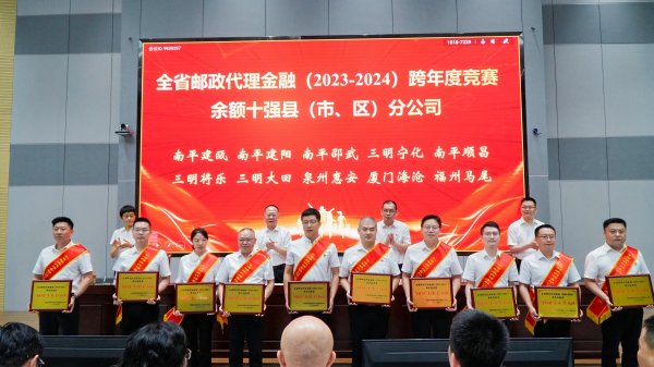 會上宣讀《關(guān)于郵政代理金融(2023-2024)跨年度競賽獲獎單位的表彰通報》。省分公司領(lǐng)導(dǎo)為在主會場的全省先進(jìn)單位代表頒獎。會上,獲得全國跨賽“百優(yōu)地市”的南平市分公司,全省余額保險“十強縣”的三明寧化縣分公司和獲得全國跨賽“千佳綜合網(wǎng)點”的莆田仙游賴店網(wǎng)點負(fù)責(zé)人分別作了先進(jìn)經(jīng)驗分享。會議要求,受到表彰的單位珍惜榮譽、再接再厲,再創(chuàng)佳績;全體員工要以先進(jìn)典型為榜樣,砥礪奮進(jìn)、比學(xué)趕超,共同推進(jìn)全省郵政代理金融業(yè)務(wù)高質(zhì)量發(fā)展。