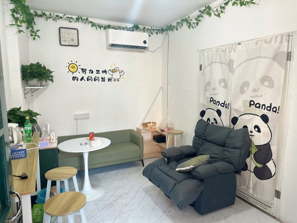 細致規(guī)劃精心選址,建設清新的“安樂小屋”。郊區(qū)局所雖然局房面積較大,但大多與生產場地非同一樓層,無法高效利用,員工體驗度不高的問題普遍存在。經過多次實地走訪調研,最終選定廟鎮(zhèn)支局緊臨支局主樓北側,連接于投遞操作間西側,原兩間物料間,其中具有采光通風條件的“外間”作為休息室,里間用于放置冰箱等物品,面積雖然只有10㎡,但與生產場地僅一墻之隔,自帶的區(qū)位優(yōu)勢很好的滿足了休息室“方位近”的建設標準,非常方便職工利用碎片時間休憩放松。休息室整體為“白綠”小清新格調,“郵政綠”的沙發(fā)、綠色的半透光玻璃木門、綠色的植物、用于遮擋空調管線的塑料綠色藤蔓,可愛的熊貓竹子裝飾門簾,原木色的小書柜,充滿正能量的標語貼。。。通過大家的精心裝置,小屋營造出了一種寧靜溫馨,鮮活怡人的氛圍,讓職工在忙碌的工作之能夠享受到媲美家的安樂與舒心。