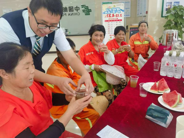 “師傅,天氣熱,喝點(diǎn)綠豆湯,歇一歇!”白沙四路網(wǎng)點(diǎn)郵愛驛站工作人員為奔波一上午的戶外工作者一一遞出清涼飲品,并為他們貼心準(zhǔn)備了可口的西瓜。 負(fù)責(zé)張家灣街道路面道路清掃的環(huán)衛(wèi)工人劉鳳香接過綠豆湯,感動地說:“這么熱的天,能收到郵政送來的清涼,心里真的很舒服,謝謝你們!”