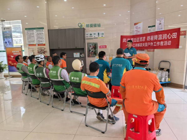 在上海路網(wǎng)點(diǎn)郵愛驛站,全國五一勞動獎?wù)芦@得者徐龍,作為戶外工作者的一份子,從如何避免高溫中暑、夏日戶外防暑必備物及使用方法、中暑之后的應(yīng)急措施等方面,為大家講解夏日防暑攻略,在場的戶外工作者紛紛表示這份防暑攻略提高了大家夏日防暑安全的重視,也學(xué)習(xí)到了很多關(guān)于如何防止中暑的方法。